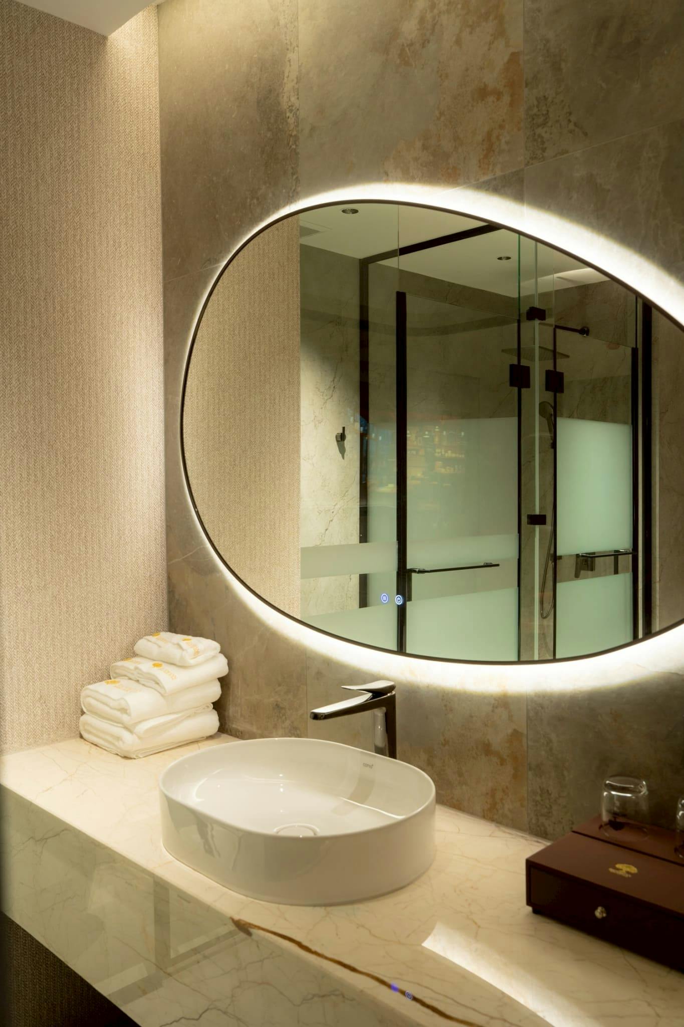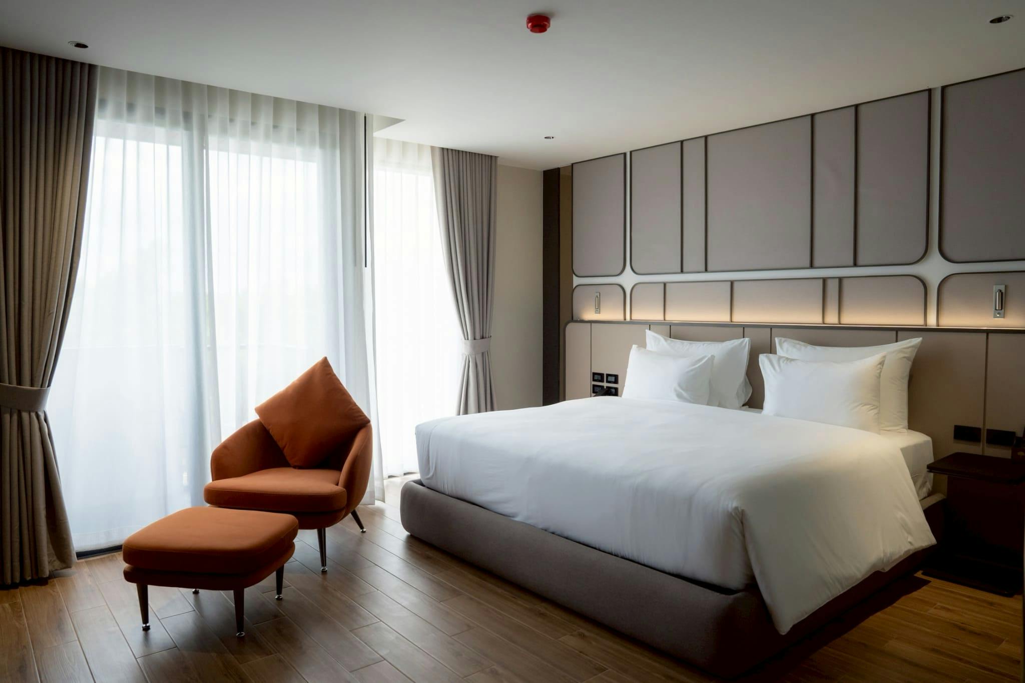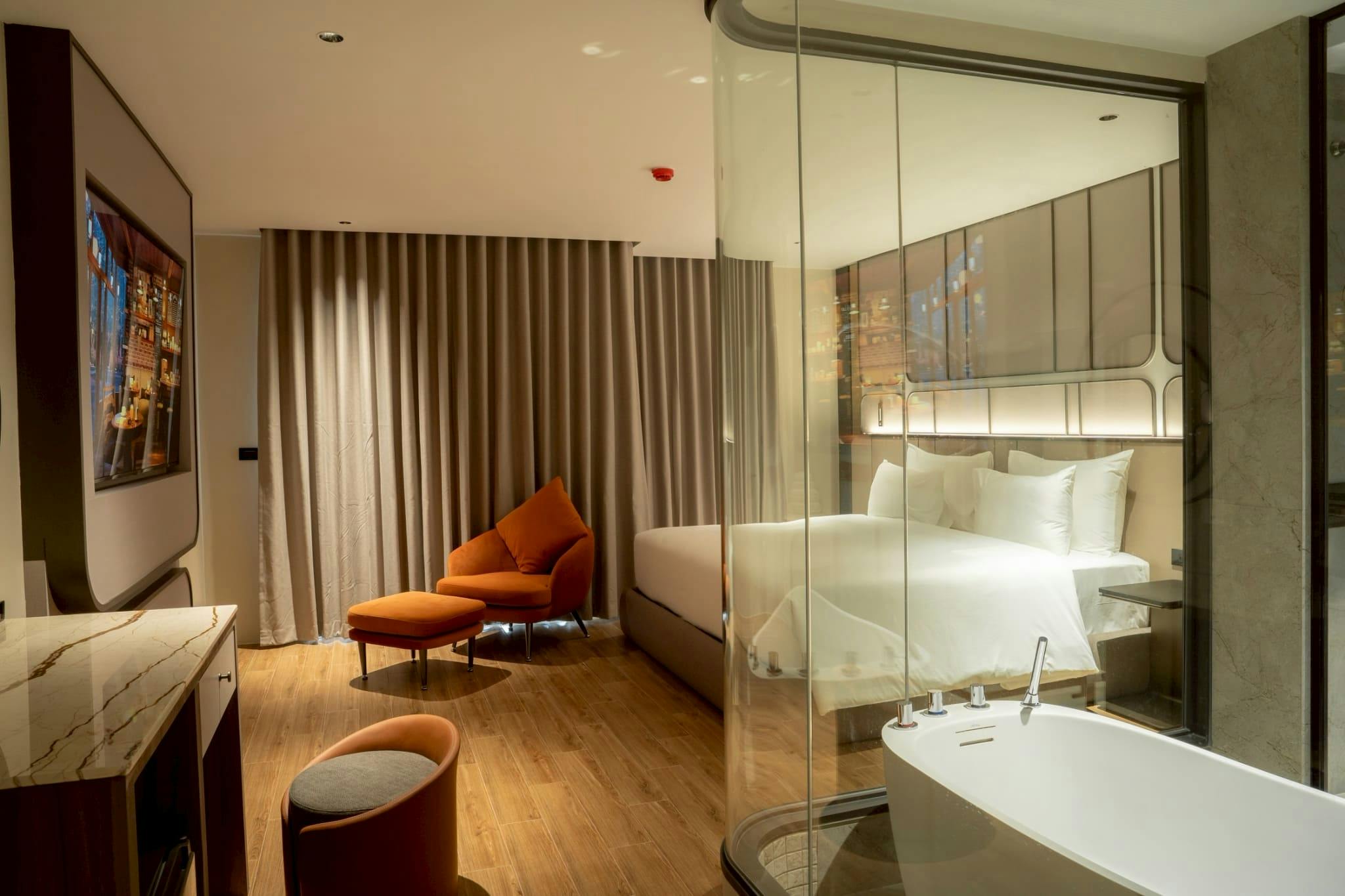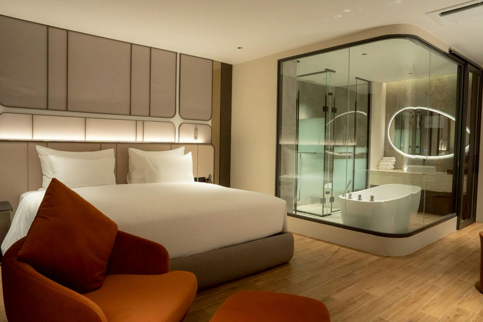 Reward your curiorsity in 42.6 sqm room offers fully-furnished with comfy super king size bed of Royal luxury slumberland bed, 55" SMART TV, minibar, complimentary high speed internet, rainshower, bathtub, hairdryer 1800 watts, and spacious balcony. ห้องขนาด 42.6 ตร.ม. การตกแต่งครบครัน ให้คุณสัมผัสความนุ่มสบายเป็นพิเศษจากเตียงสลัมเบอร์แลนด์ขนาด 7 ฟุต พร้อมด้วยชุดเครื่องนอนที่ผลิตจากเส้นใยผ้าคุณภาพสูง สมาร์ททีวี 55 นิ้ว มินิบาร์ อินเทอร์เน็ตความเร็วสูง ห้องอาบน้ำเรนชาวเวอร์ อ่างอาบน้ำ ไดร์เป่าผม 1800 วัตต์ และระเบียงขนาดกว้างขวาง