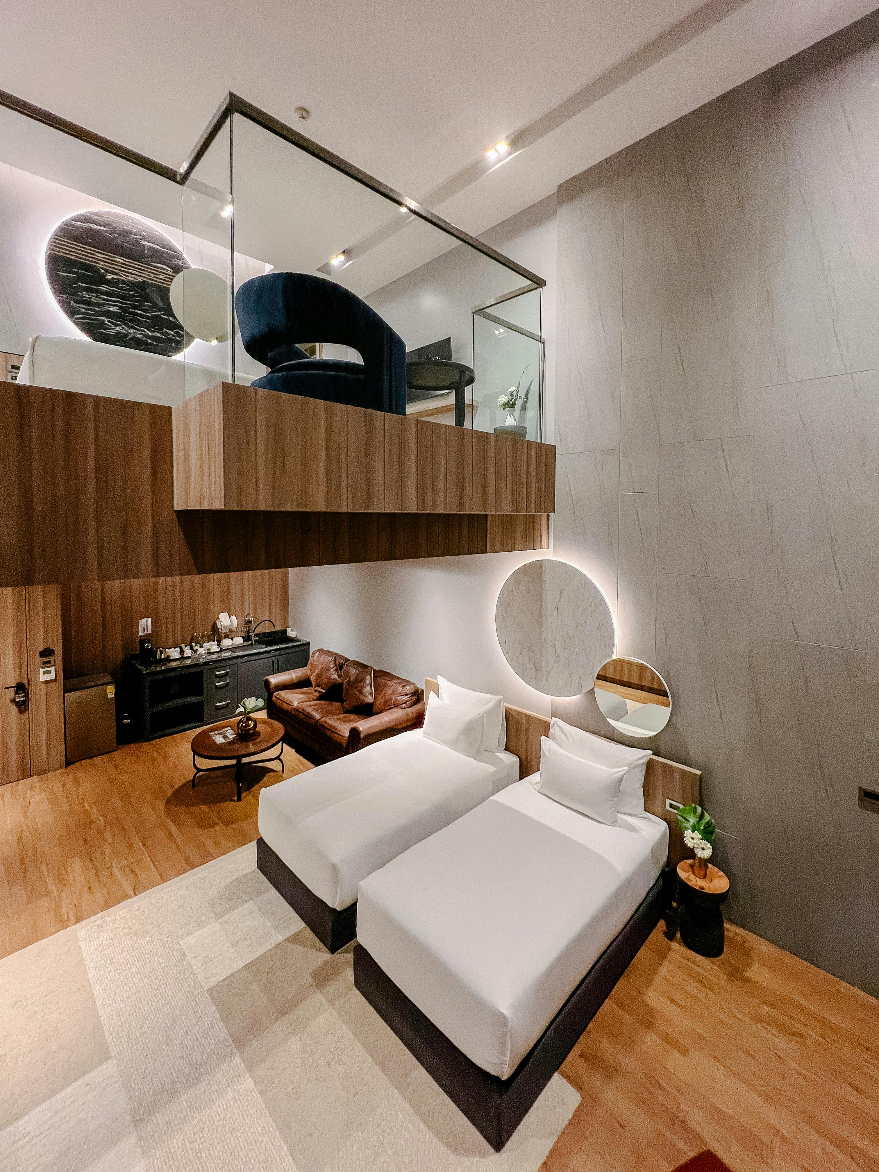 สัมผัสกับช่วงเวลาที่ดีที่สุดของคุณในห้อง 2 ชั้นที่กว้างขวาง ขนาด 77 ตร.ม. พร้อมวิวสระว่ายน้ำ และการตกแต่งครบครัน ให้คุณสัมผัสความนุ่มสบายเป็นพิเศษจากเตียงสลัมเบอร์แลนด์ขนาด 7 ฟุต พร้อมด้วยชุดเครื่องนอนที่ผลิตจากเส้นใยผ้าคุณภาพสูง โซฟาเบด พื้นที่รับประทานอาหาร สมาร์ททีวี 75 นิ้ว มินิบาร์แบบครบครัน เครื่องทำกาแฟแคปซูล โต๊ะรับประทานอาหาร อินเทอร์เน็ตความเร็วสูงฟรี ห้องอาบน้ำเรนชาวเวอร์ อ่างอาบน้ำ ไดร์เป่าผม 1800 วัตต์ และระเบียงขนาดกว้างขวาง