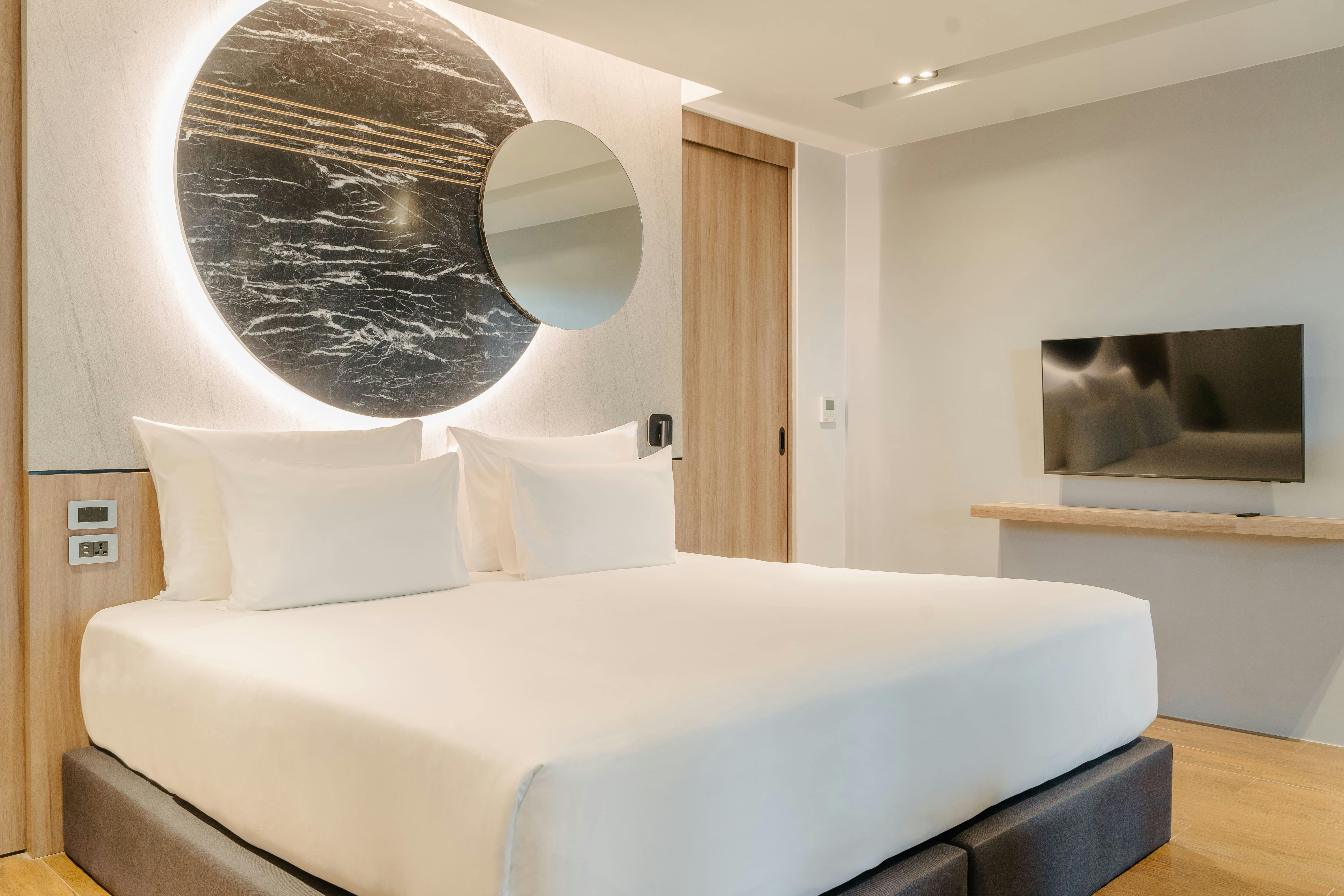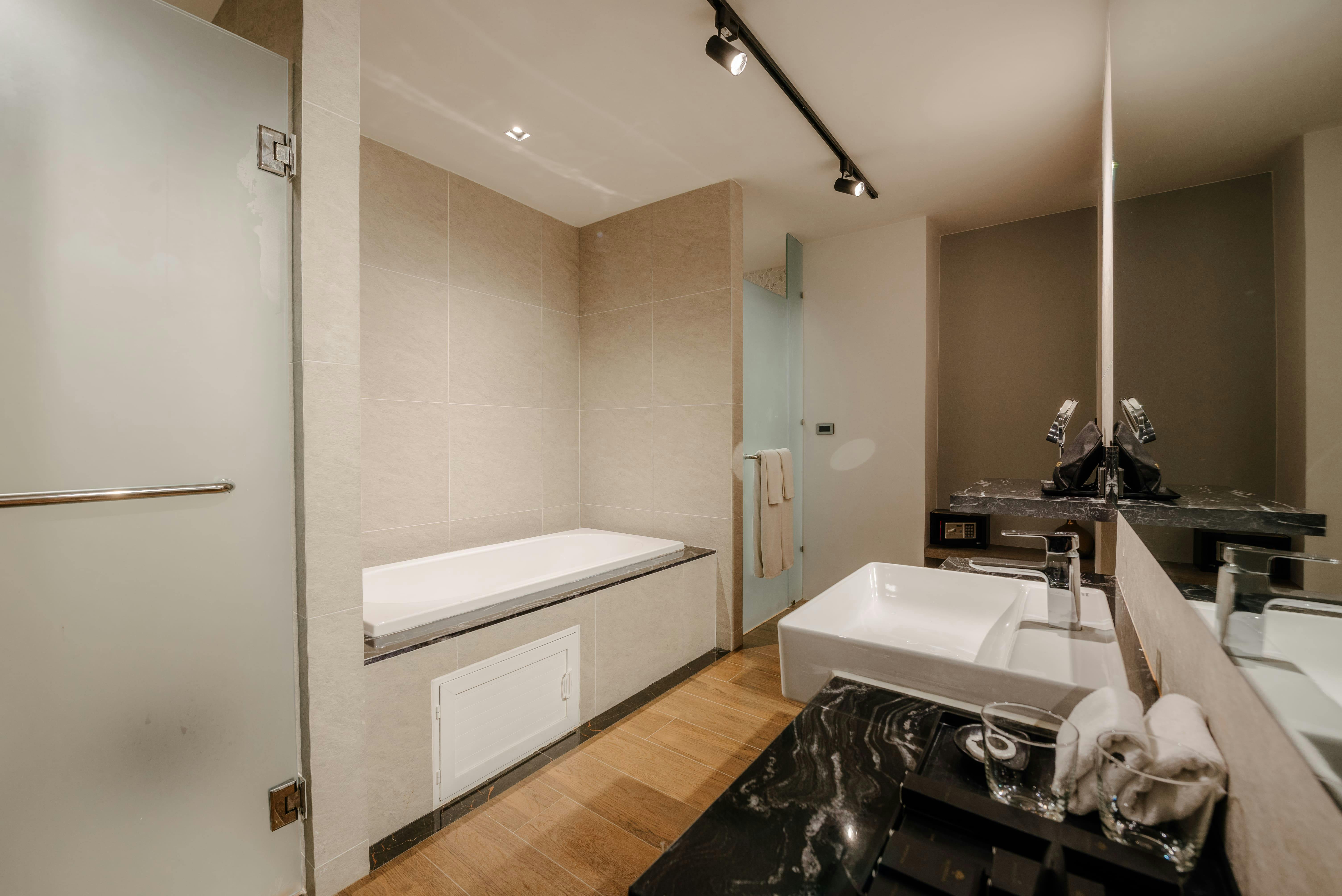 Collect the ultimate time in the spacious 77sqm 2 storey room with pool view and fully-furnished with comfy super king size bed of Royal luxury slumberland bed, sofa bed, dinning area, 75" SMART TV, full served minibar, coffee capsule, complimentary high speed internet, rainshower, bathtub, hairdryer 1800 watts, and spacious balcony.