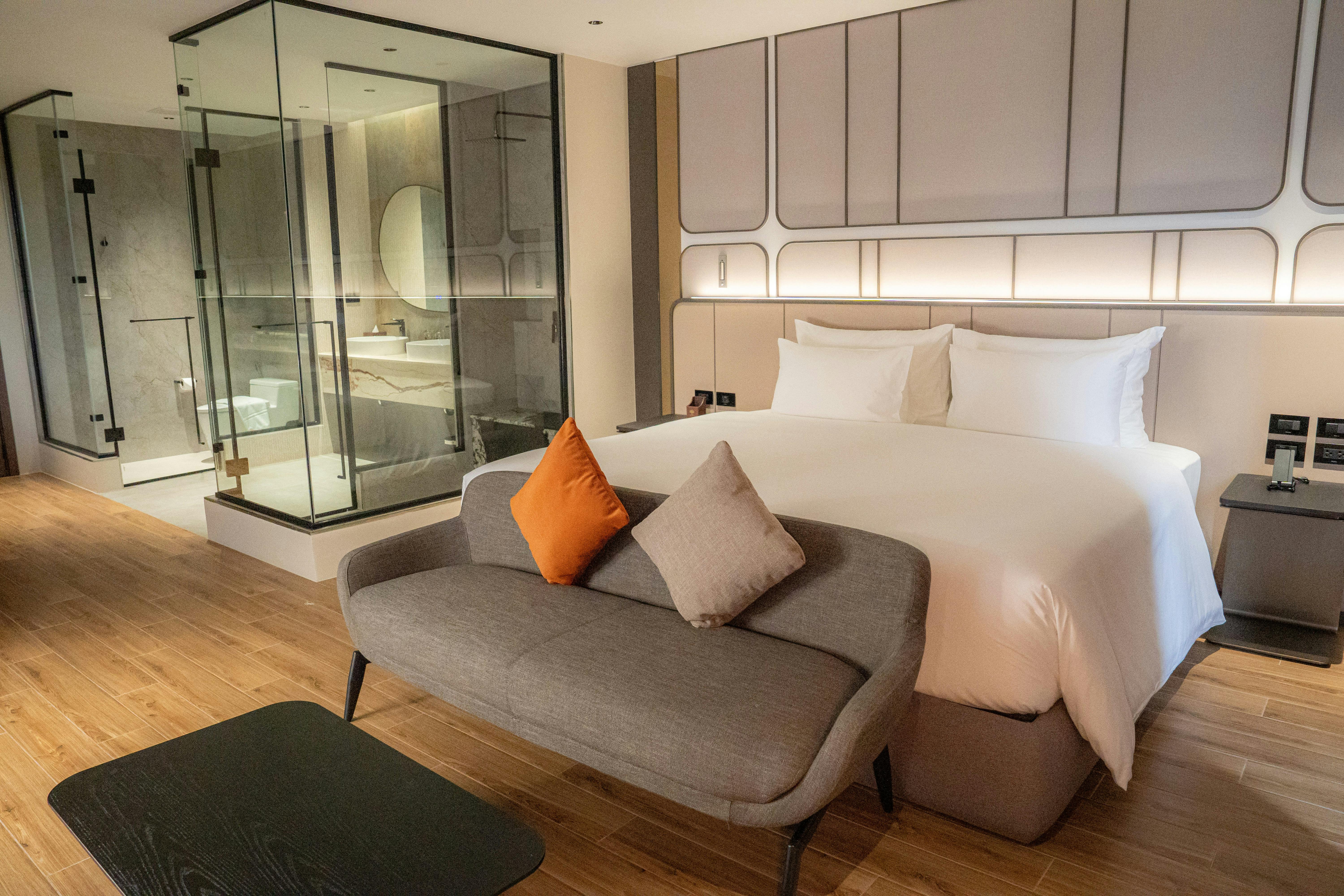 Reward your curiorsity in 66 sqm room offers fully-furnished with comfy super king size bed of Royal luxury slumberland bed, 55" SMART TV, minibar, complimentary high speed internet, rainshower, bathtub, hairdryer 1800 watts, and spacious balcony. ห้องขนาด 66 ตร.ม. การตกแต่งครบครัน ให้คุณสัมผัสความนุ่มสบายเป็นพิเศษจากเตียงสลัมเบอร์แลนด์ขนาด 7 ฟุต พร้อมด้วยชุดเครื่องนอนที่ผลิตจากเส้นใยผ้าคุณภาพสูง สมาร์ททีวี 55 นิ้ว มินิบาร์ อินเทอร์เน็ตความเร็วสูง ห้องอาบน้ำเรนชาวเวอร์ อ่างอาบน้ำ ไดร์เป่าผม 1800 วัตต์ และระเบียงขนาดกว้างขวาง